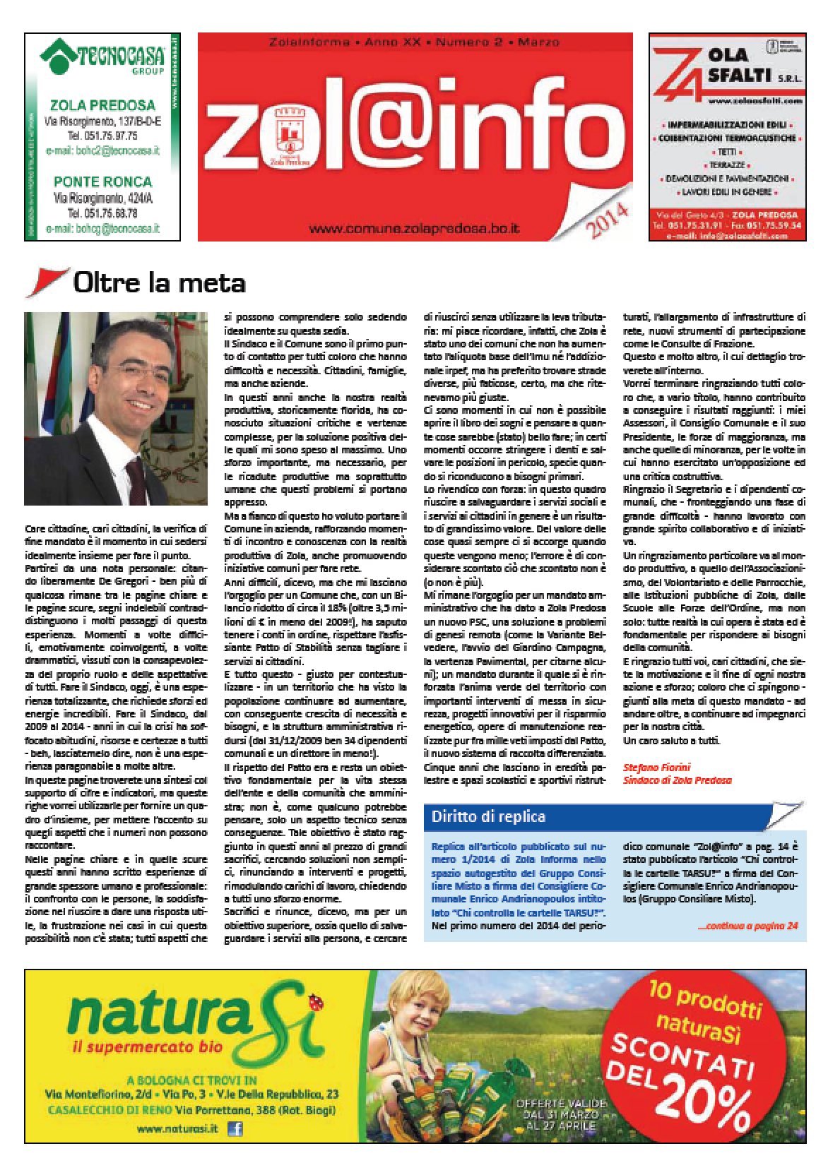 Zola Informa n. 2/14 Anno XX - Numero 2 - marzo 2014 | Speciale fine mandato 2009/2014 | Chiuso in tipografia il 27 marzo 2014 Clicca per vedere l'immagine alle dimensioni originali… Dimensione: 635KB